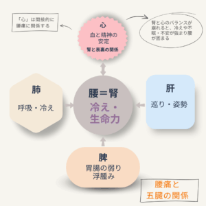 腎が弱ると体の熱を保てず、冷えや腰のだるさとして現れるんですよね。